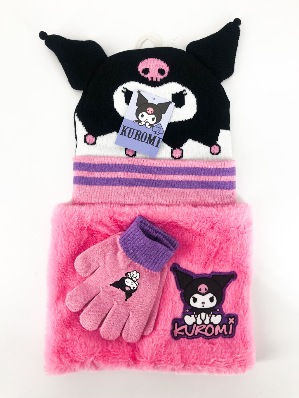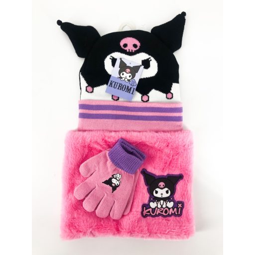 Kuromi gyerek lány kötött szett: sapka, sál, kesztyű
